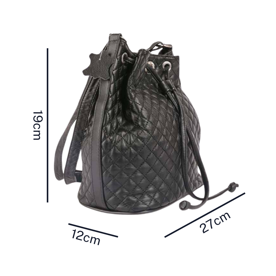 Explore functionality and style with our lambskin leather shoulder bag, crafted from Eco-conscious lambskin leather. Boasting a distinctive drawstring closure and turn lock clasp closure, along with an intricate diamond pattern, this bag is both durable and chic. Perfect for everyday use, its spacious interior ensures practicality without compromising on elegance, all while reflecting a commitment to Natural materials and Sustainable craftsmanship.