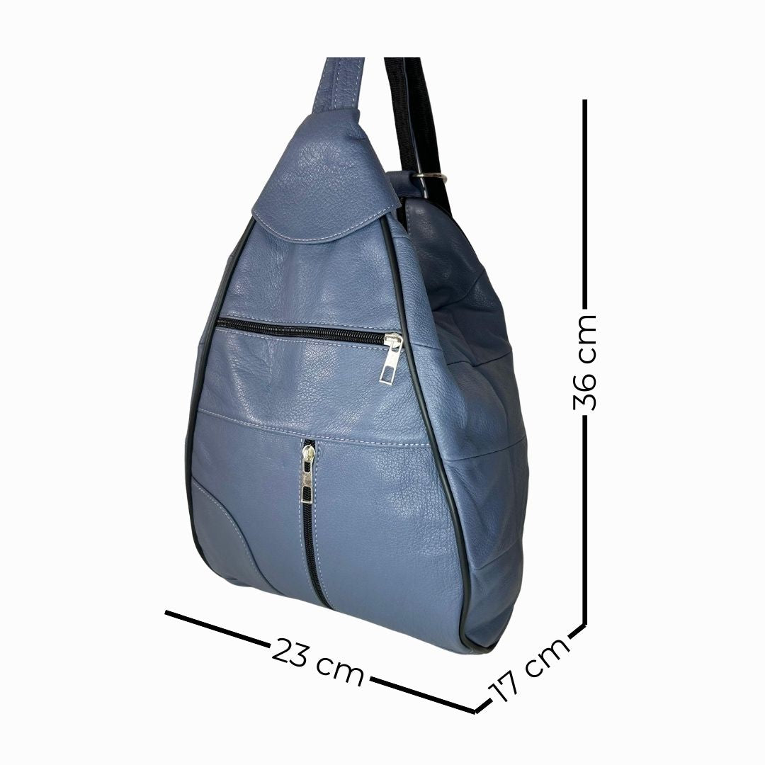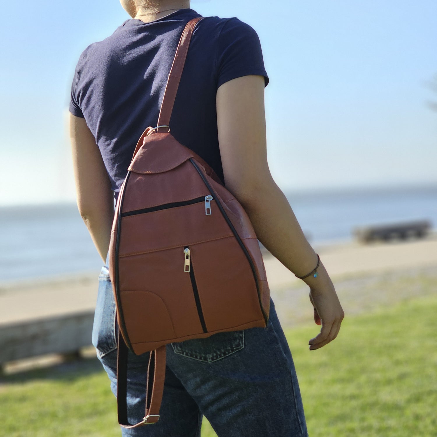 Introducing our unique backpack, crafted from Genuine Lambskin Leather pieces and designed with Eco-friendly principles in mind. This stylish bag features a tapered design with a wider base for extra space, and comes with four straps: two top handles for easy carrying and two straps that zip together for backpack use. It boasts three zippered pocketstwo on the front (one vertical, one horizontal) and one horizontal pocket at the back. With its spacious interior and versatile functionality, this beautiful backpack is perfect for all your needs, reflecting a commitment to Natural materials and Sustainable craftsmanship.