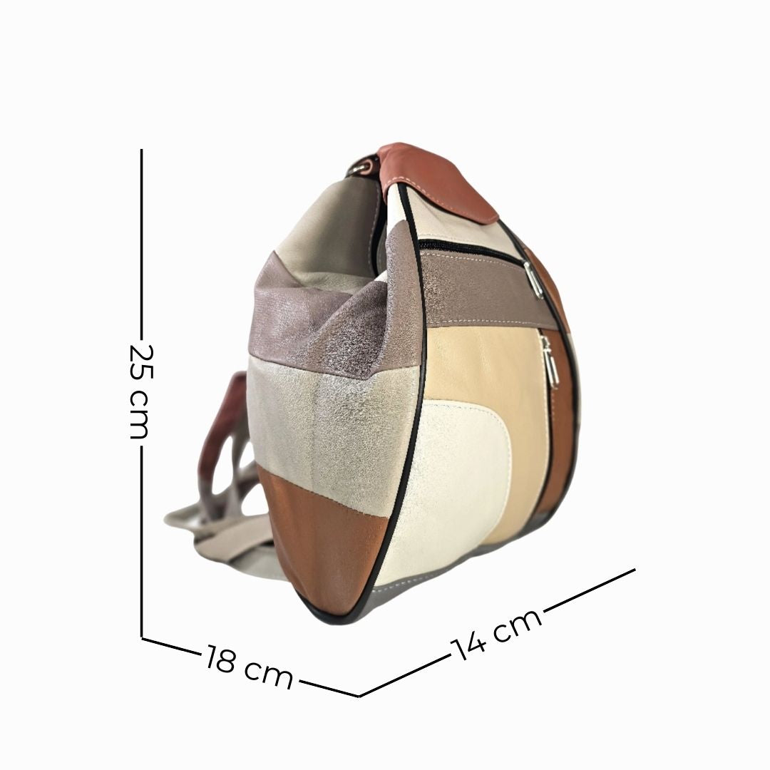 Introducing our unique backpack crafted from Genuine Lambskin Leather pieces and designed with Eco-friendly principles in mind. This stylish bag features a tapered design with a wider base for extra space and comes with four straps: two top handles for easy carrying and two straps that zip together for backpack use. It boasts three zippered pockets, two on the front (one vertical, one horizontal) and one horizontal pocket at the back. With its compact size, spacious interior and versatile functionality, this beautiful small backpack is perfect for all your needs, reflecting a commitment to Natural materials and Sustainable craftsmanship.